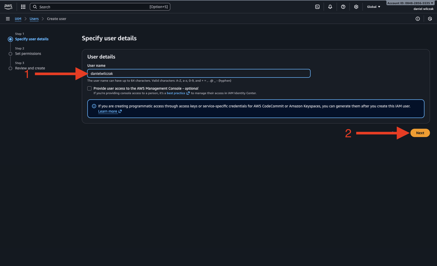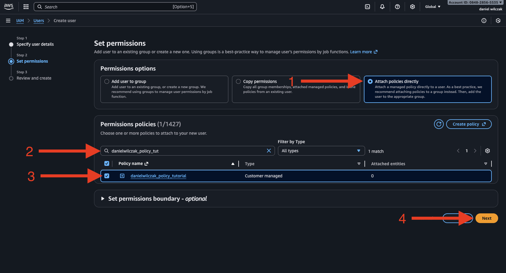 Now will select "Attach policies directly", search and select our policy, and click next.