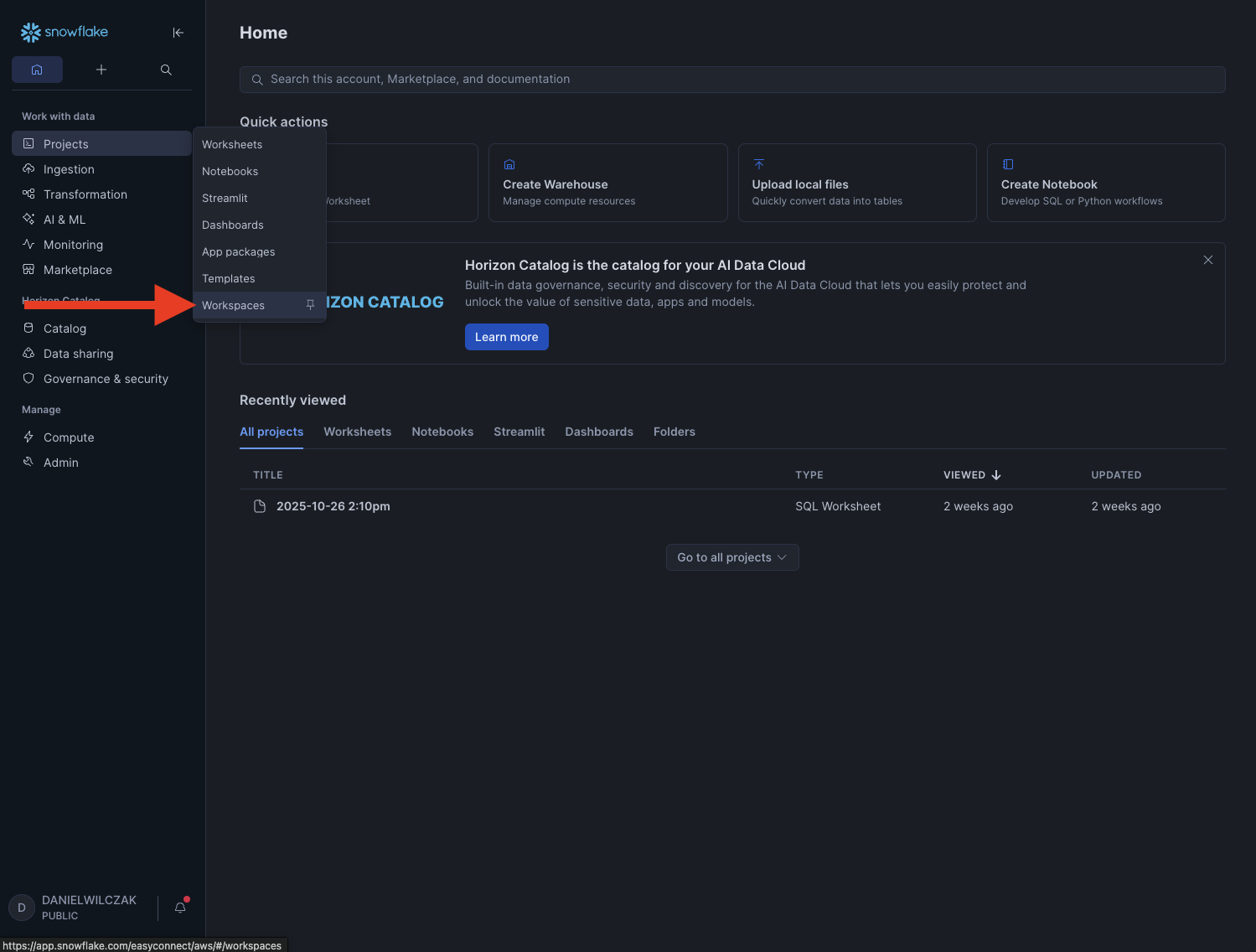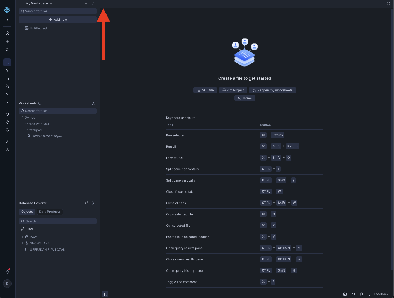 Lets now head into Snowflake and create a sql sheet in workspaces.
