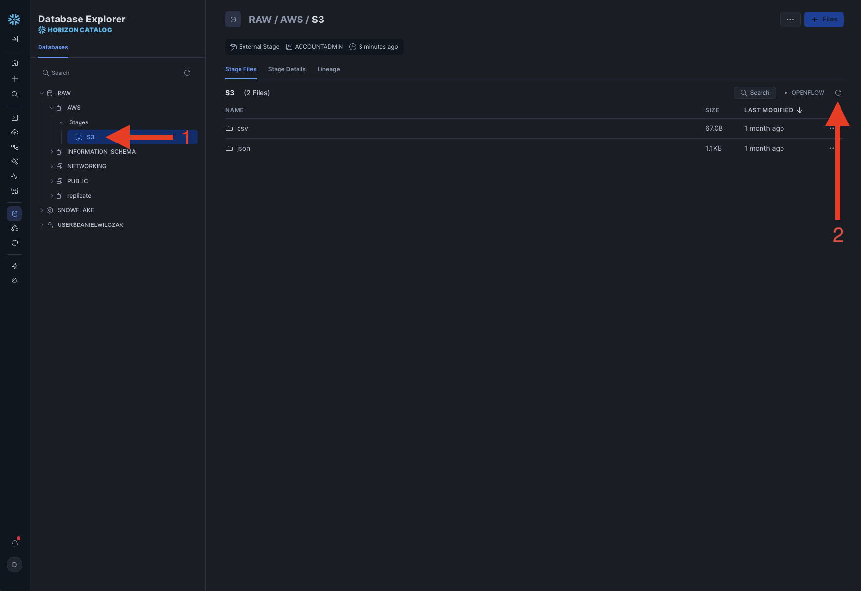 Now that we have created our stage we can go view the files in it. If you don't see the file right away, hit refresh. From here we can start loading data. But the process is the same as our S3 tutorial and not need to repeat here.