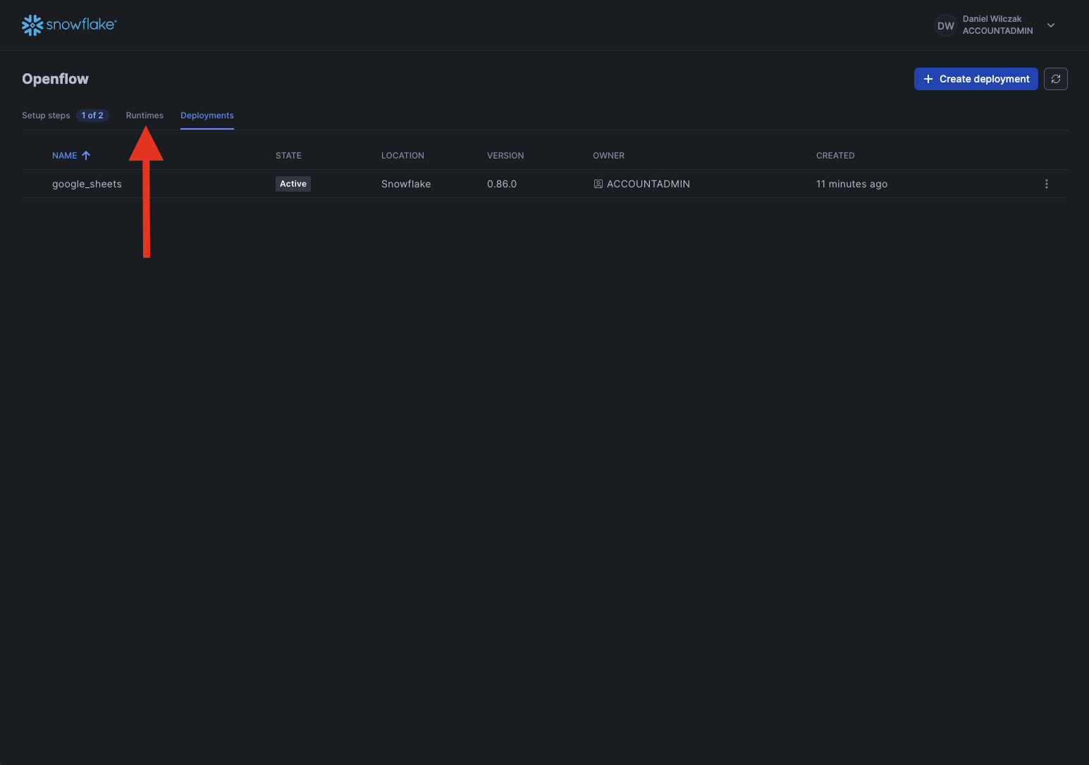 Select your deployment, next give your runtime a name, and select accountadmin as the role. Scroll down to extrnal acess.