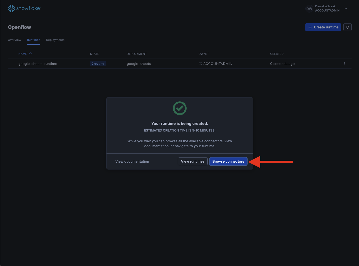 Now your runtime will start being created. Lets head to the connectors