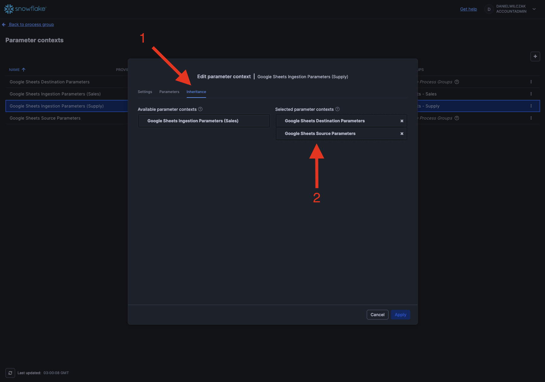 We'll select "Inheritance" in the top menu and select the destination and google source parameters because these are going to be the same for all our google sheets connectors.