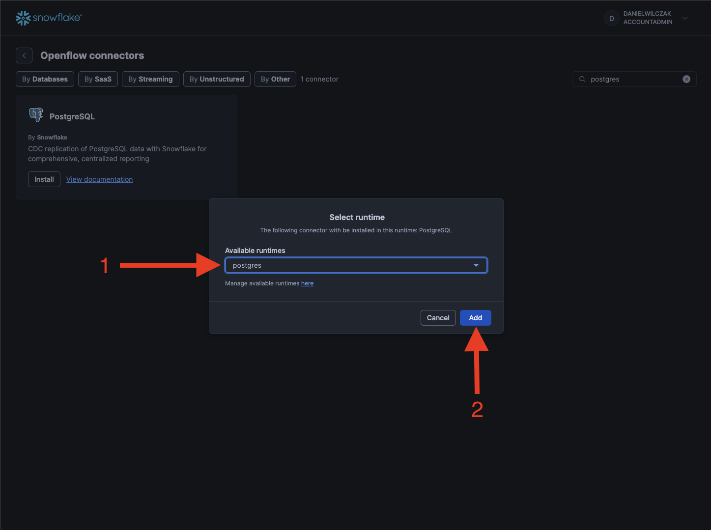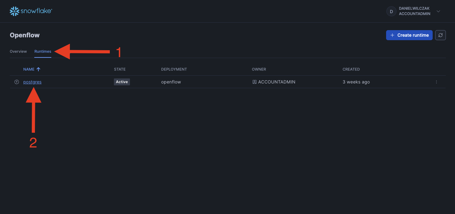 We'll then select our runtime, give it a name, select accountadmin as the role and if your on SPCS your external access integration.