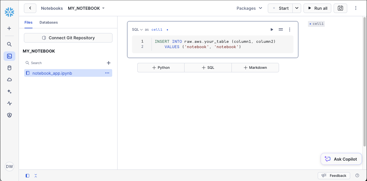 Next lets create a Snowflake notebook named "my_notebook" and enter the sql below.