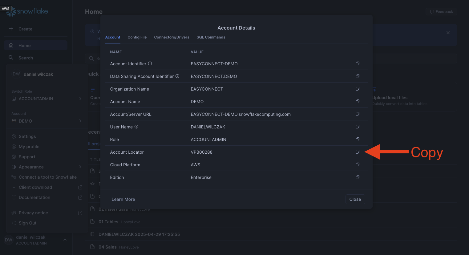 Copy the account locator, we'll need this for later.