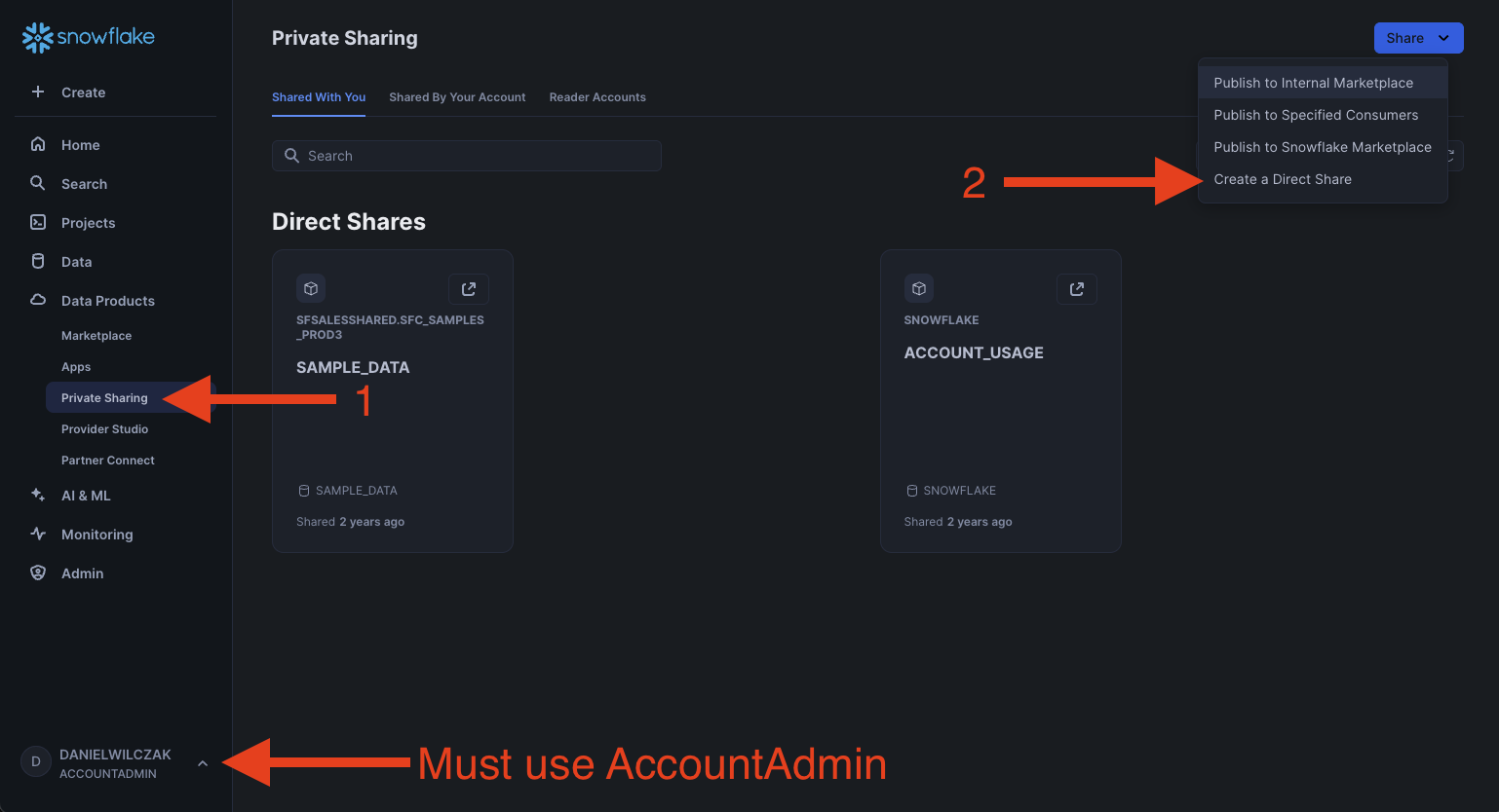 Now that we have our table, lets create a data share by going to private sharing and then in the top right clicking the dropdown to direct data sharing.