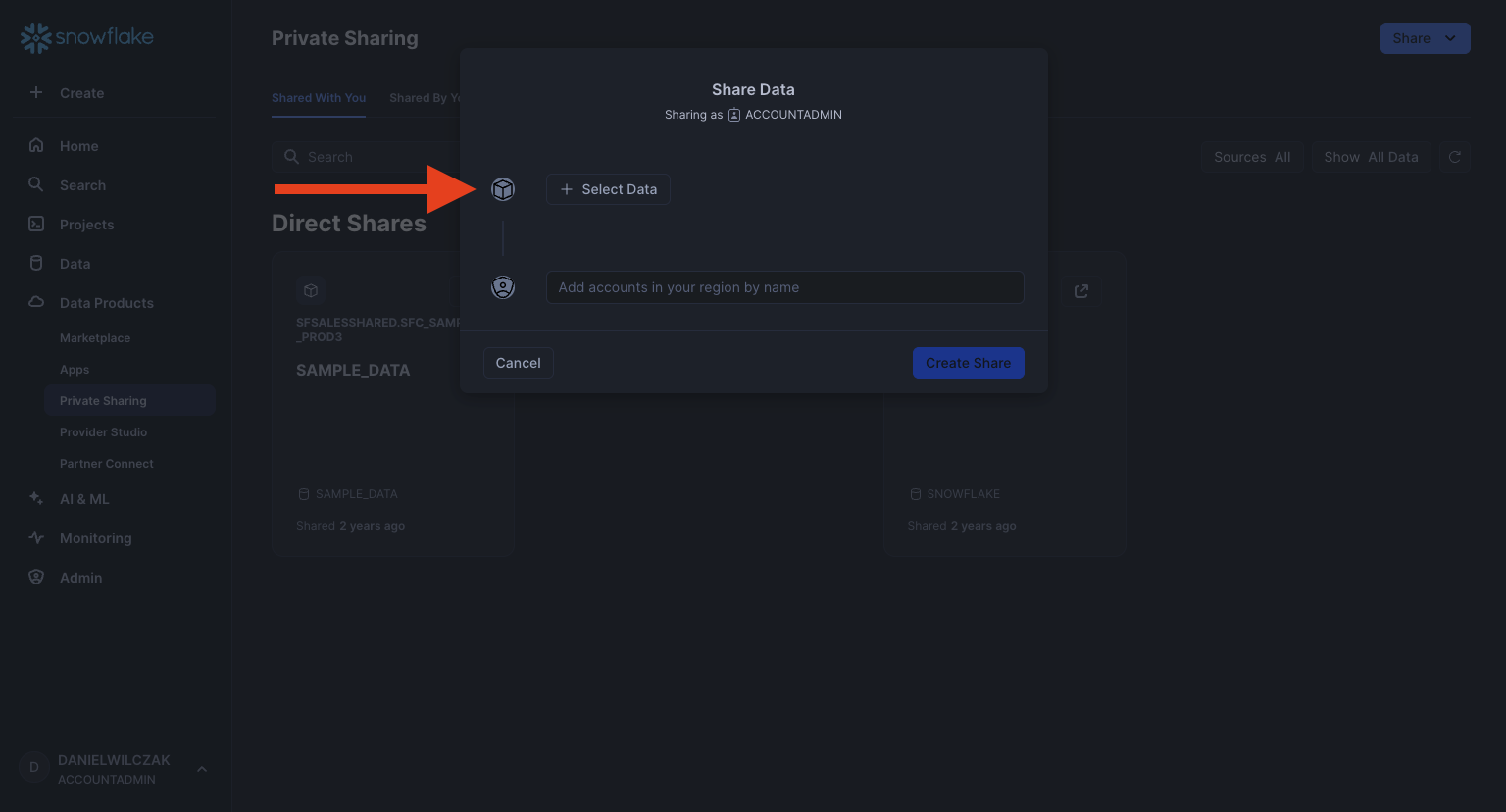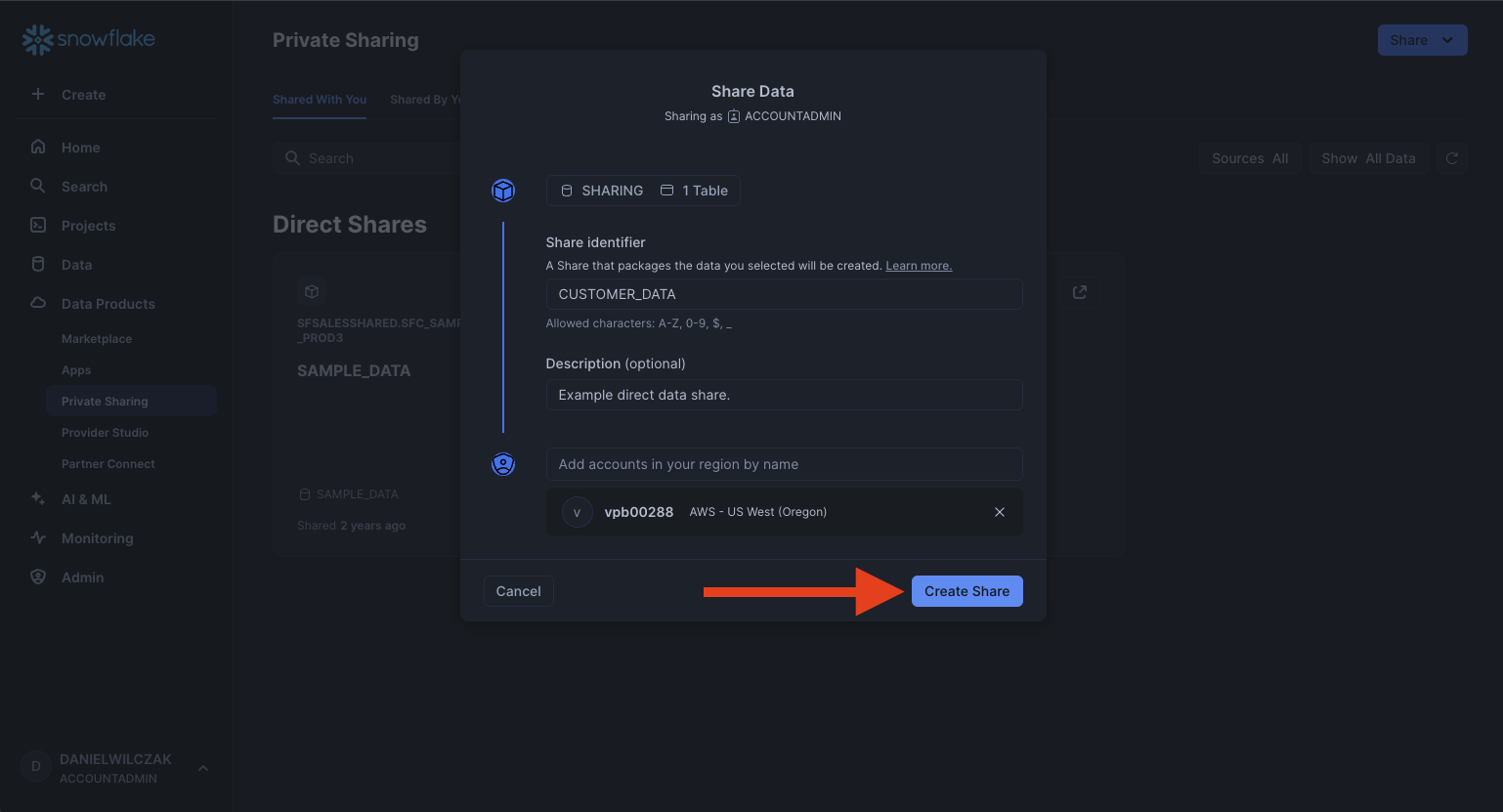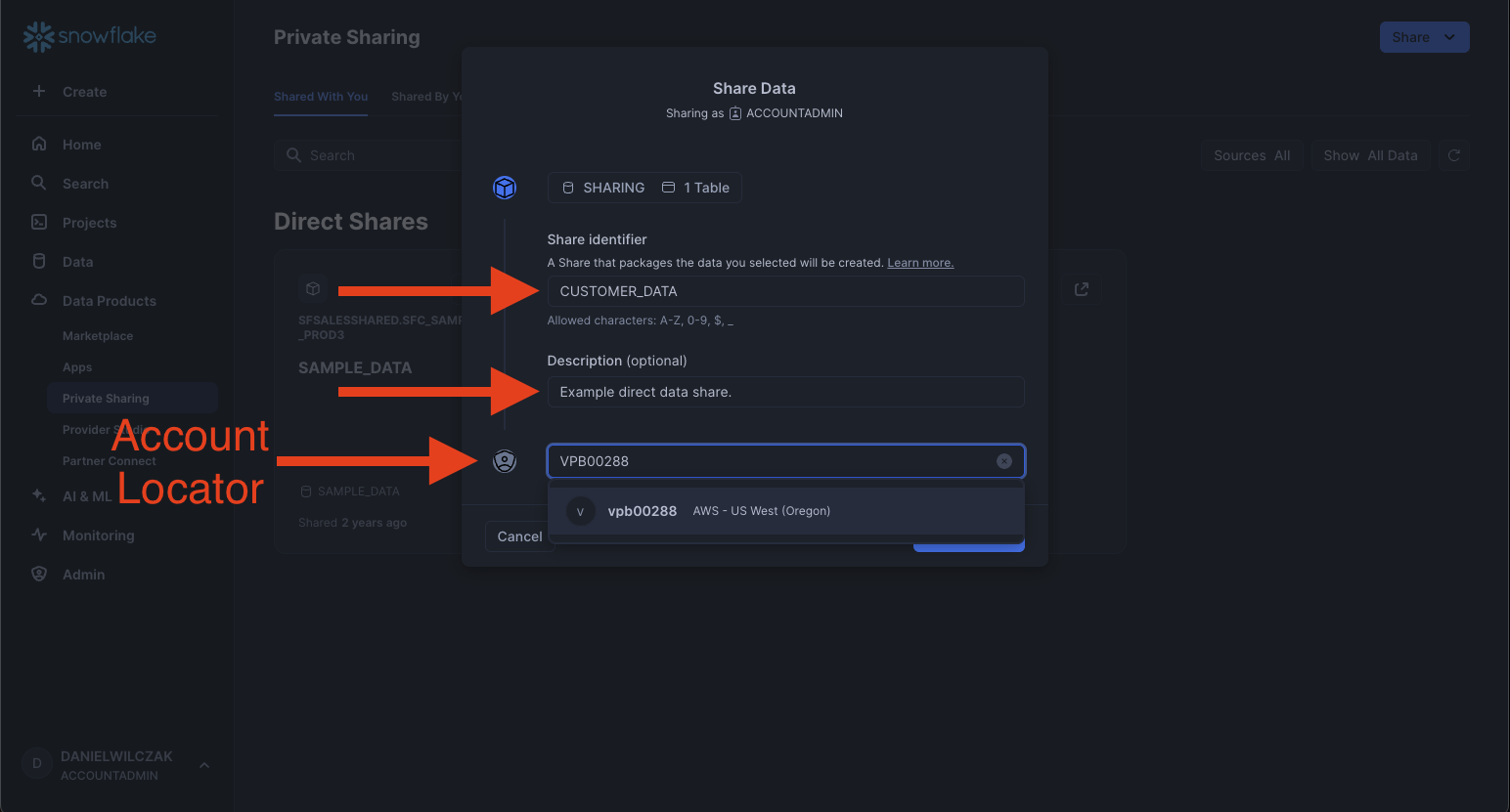 Now that we have our data selected lets give the share a name and description. The customer will see both when they add the share. Finally lets add the second accounts locator. If it's correct you will get the dropdown to select the account.