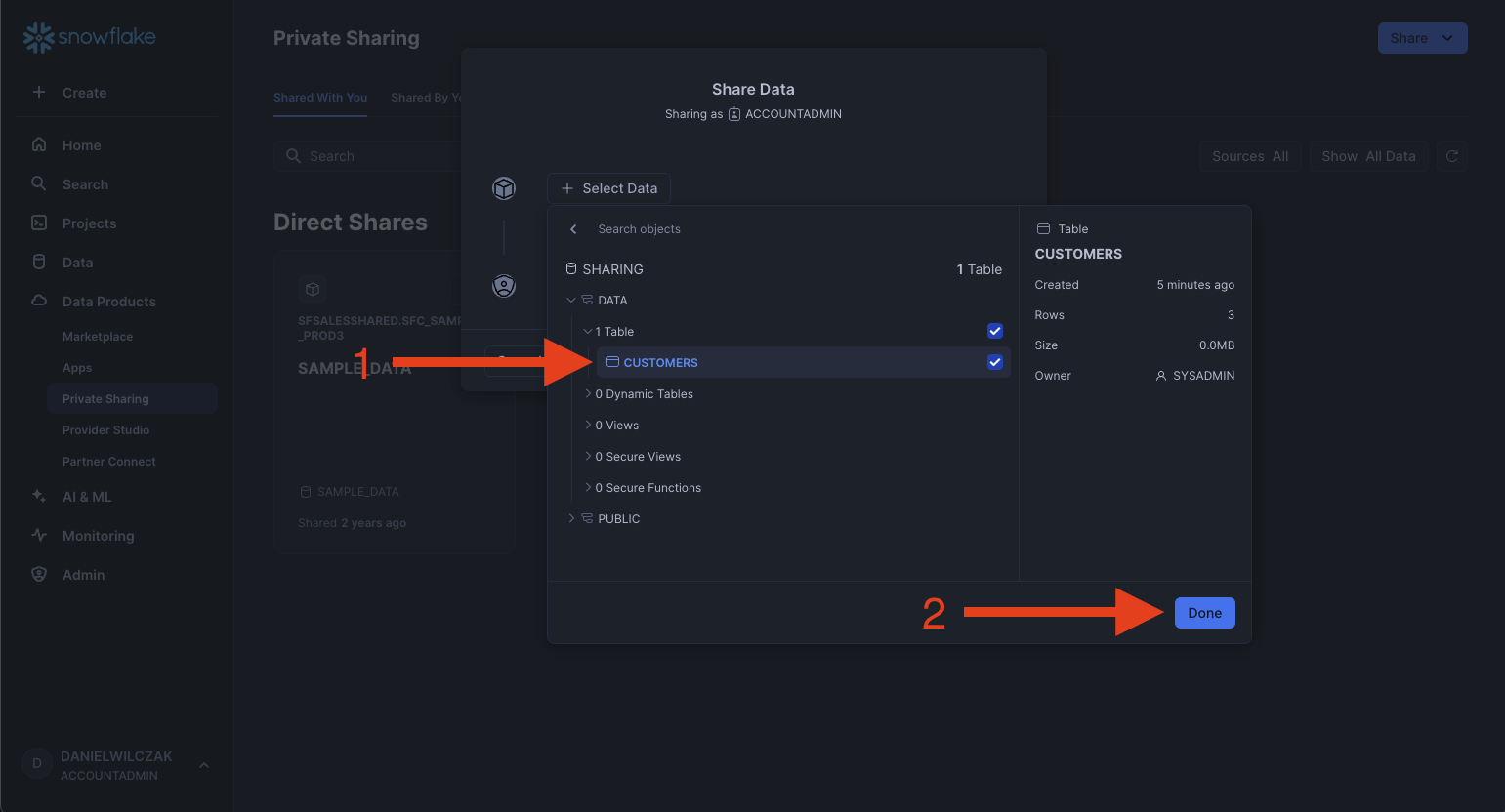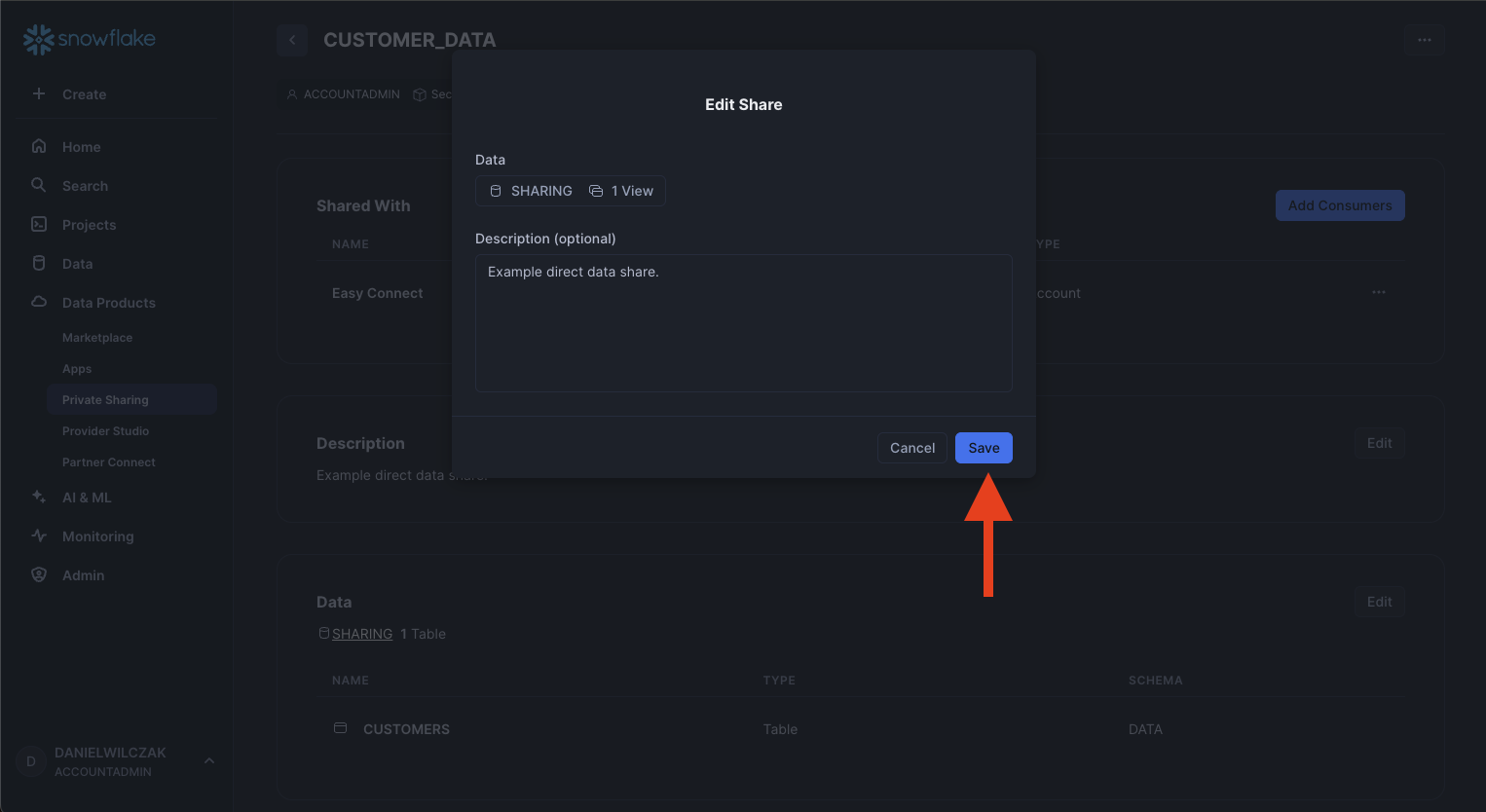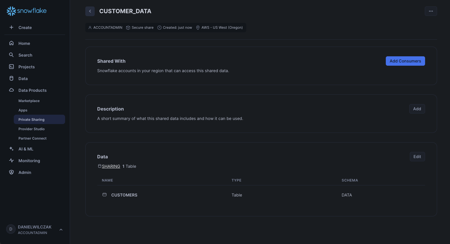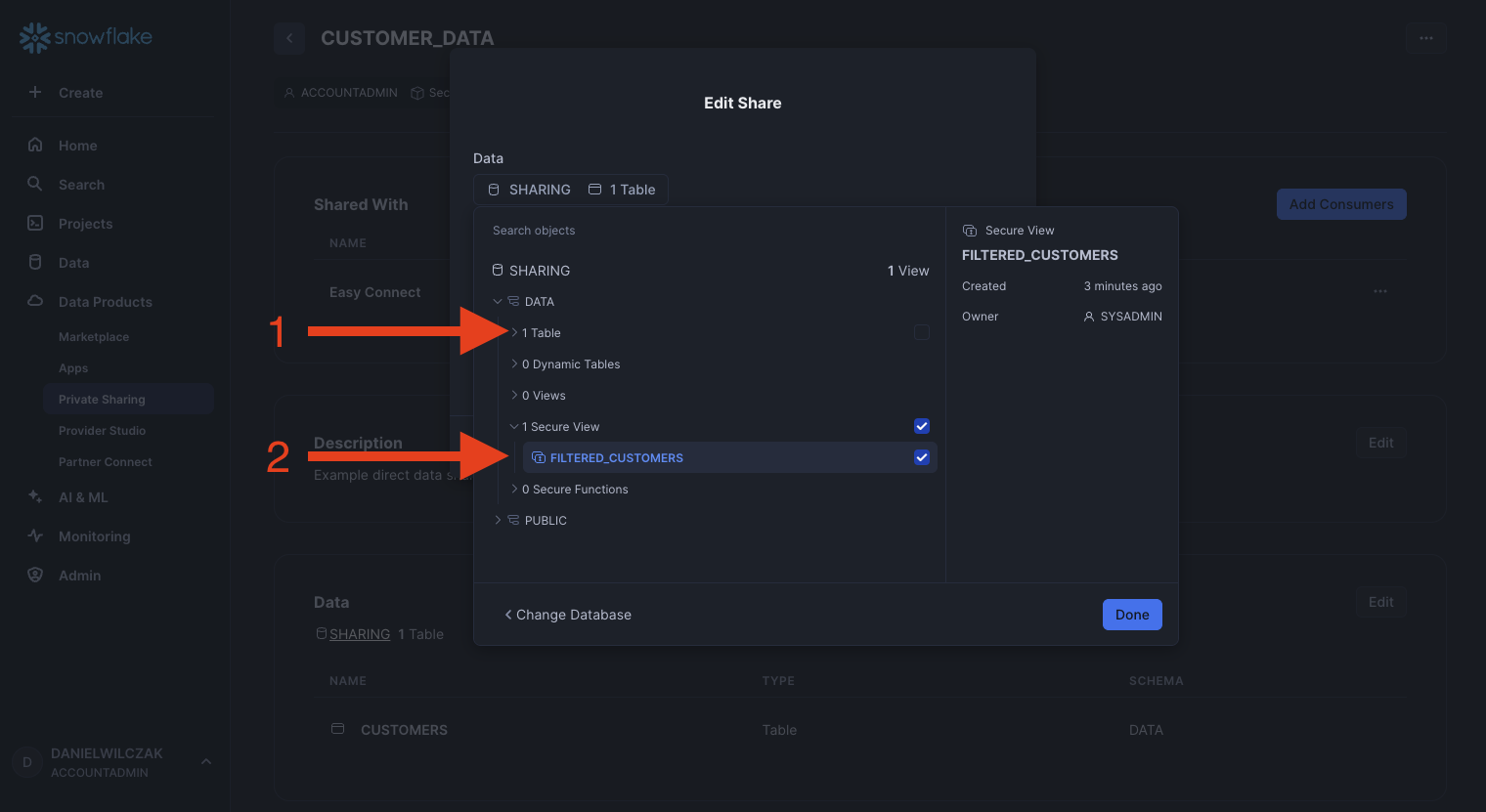 Navigate to the sharing database, data schema and finally lets select the customer data table.