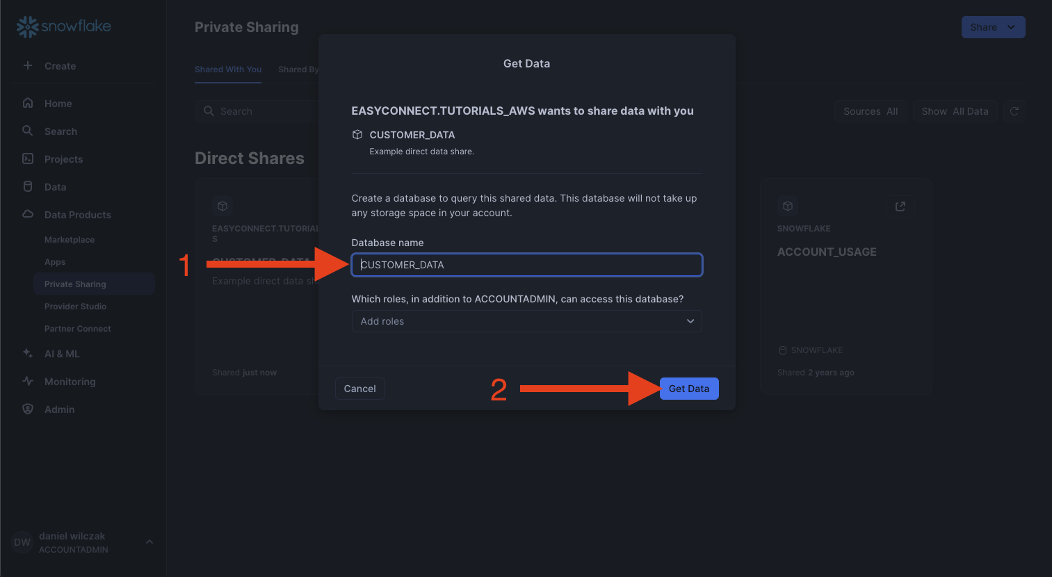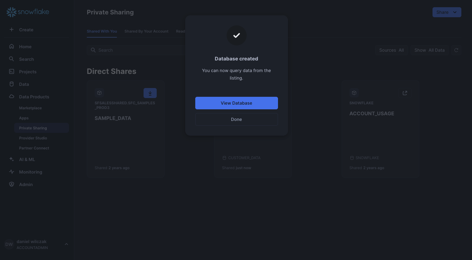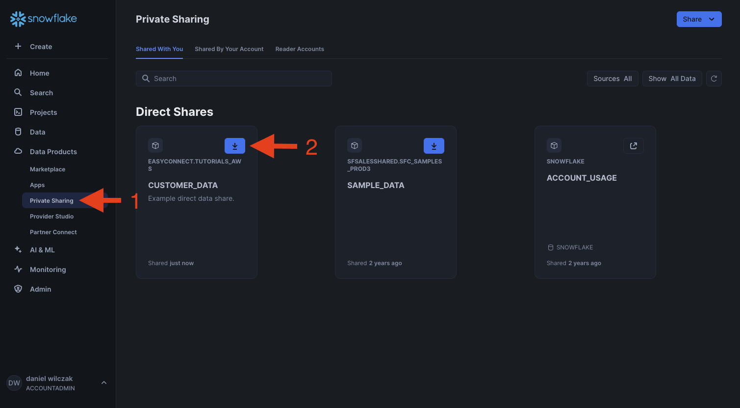 Lets now add the data share in the second account by going to private sharing and clicking the download button next to our share.