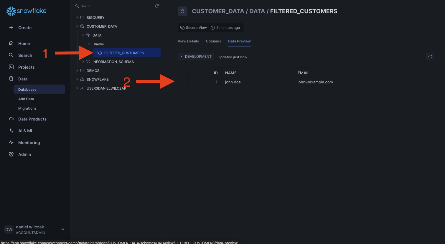 We might want to only share specific data to anther account without that account knowing how we filtered the data. To do this we will create a secure view on top of our table to filter only to rows with the name "john doe".
