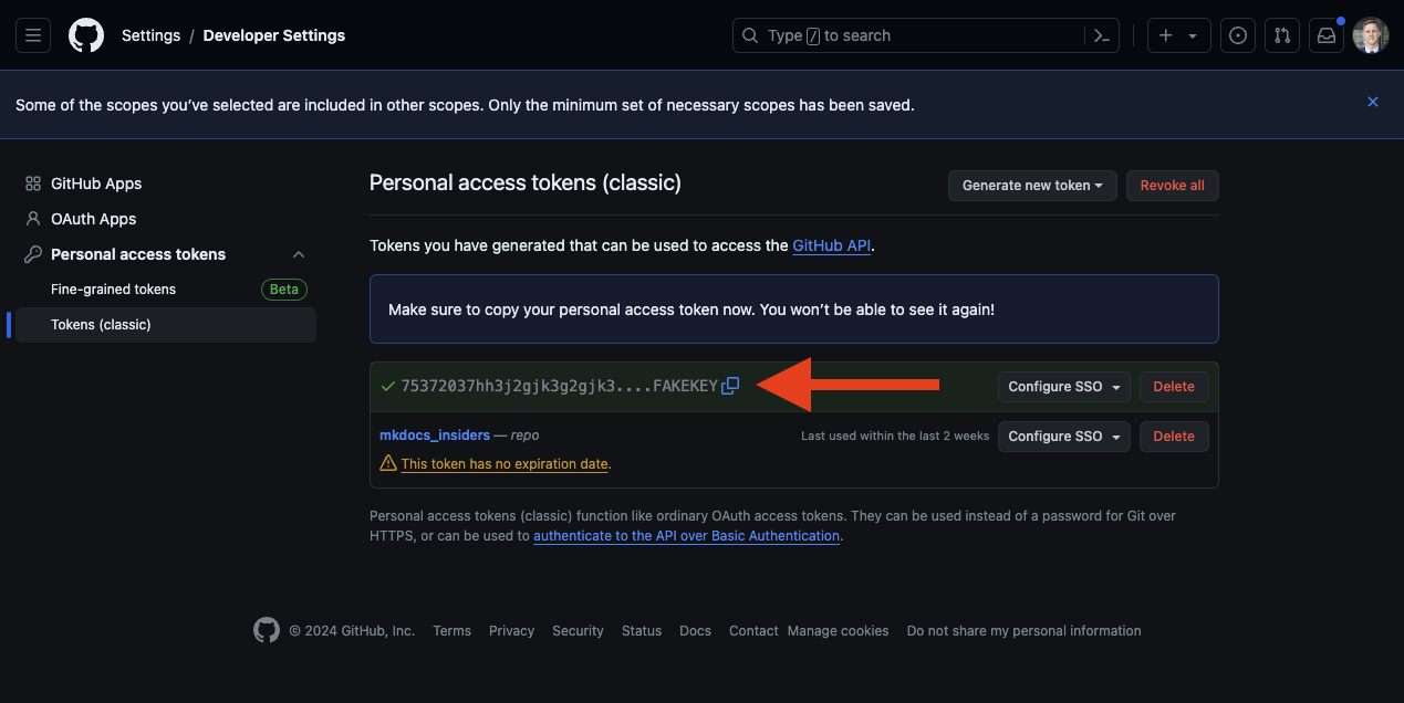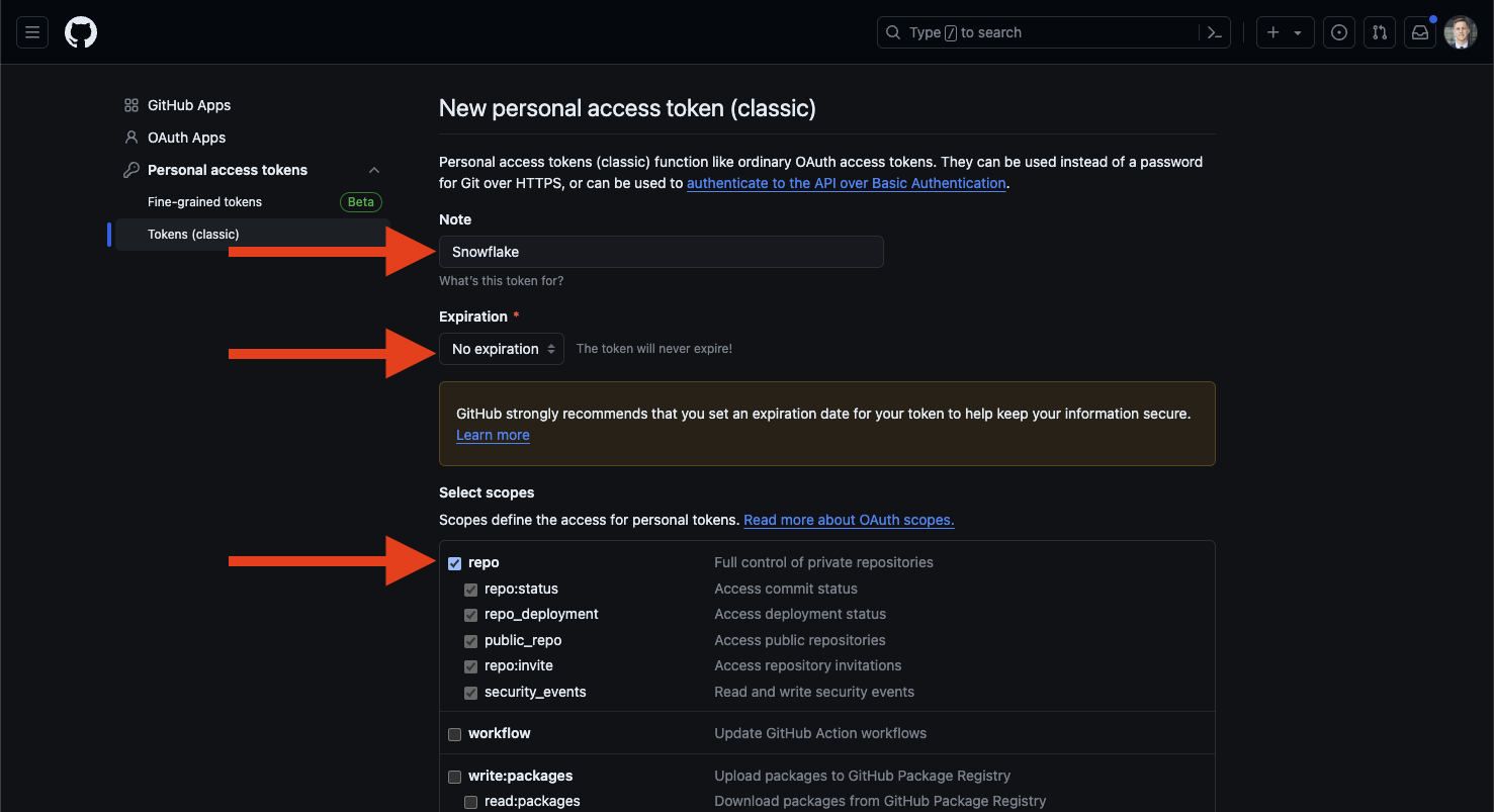 Next we'll enter in a name, the experation of the token, and select "repo" for the scope of the permissions.