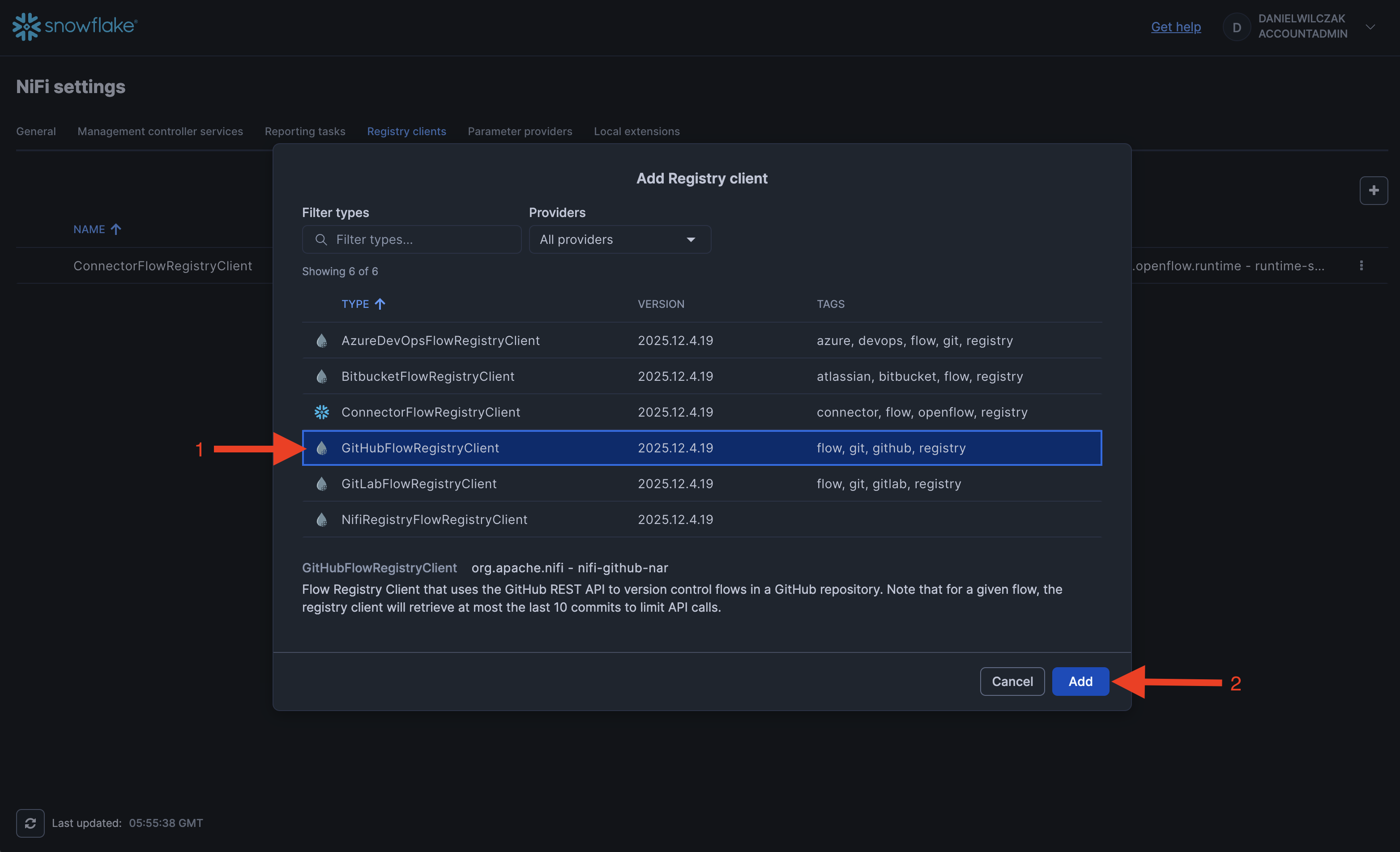 Now you'll be able to switch to the github registry and select your branch, bucket "aka folder to store into" and if you have a connector in there you'll be able to add it to the canvas. If not thats okay.