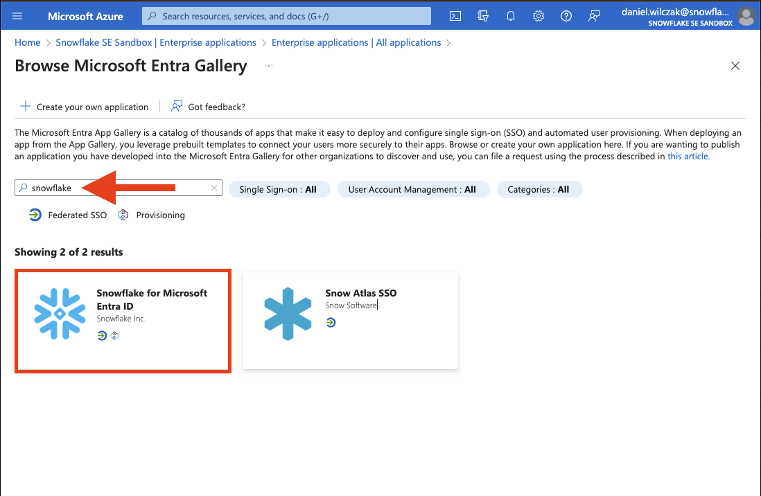 In the Browse Azure AD Gallery search bar, search for Snowflake, and choose Snowflake for Microsoft Entra ID application.