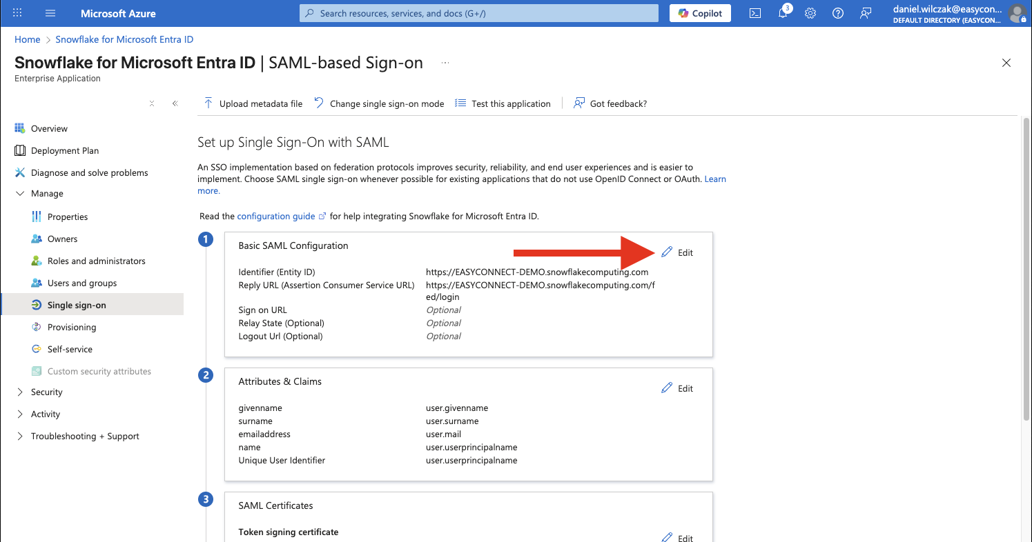 In the middle pane under the Basic SAML configuration section, click the Edit button.