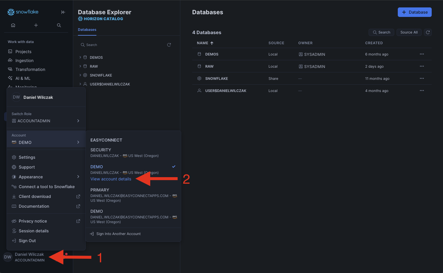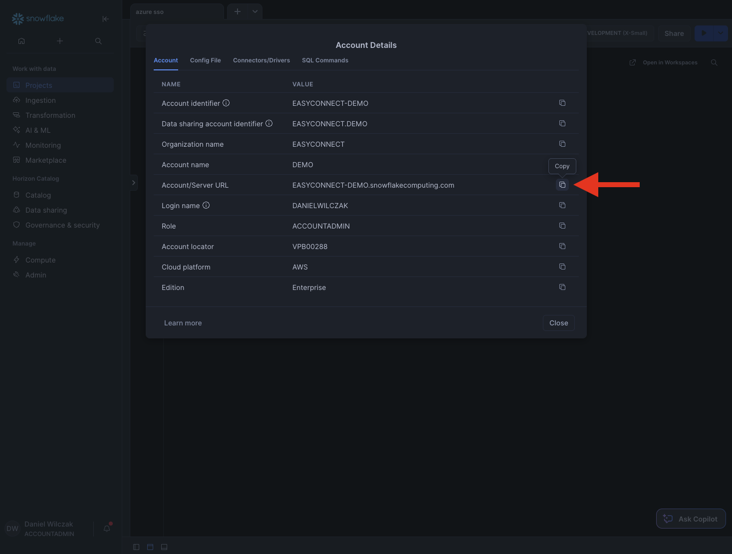 Next we'll want to get our Snowflake account URL which will be entered into the saml configuration. Lets head to Snowflake and click