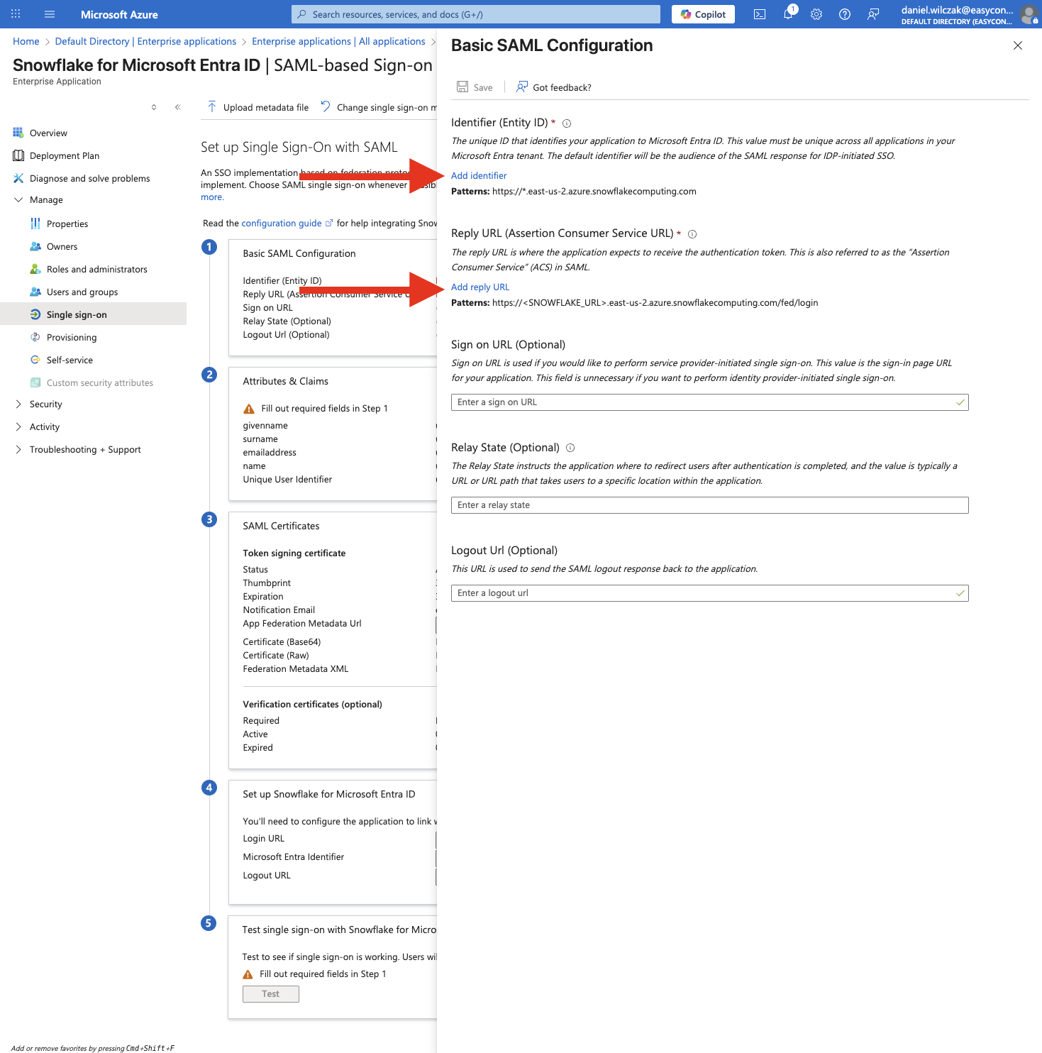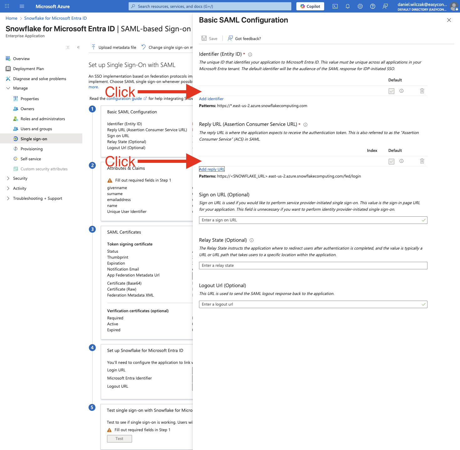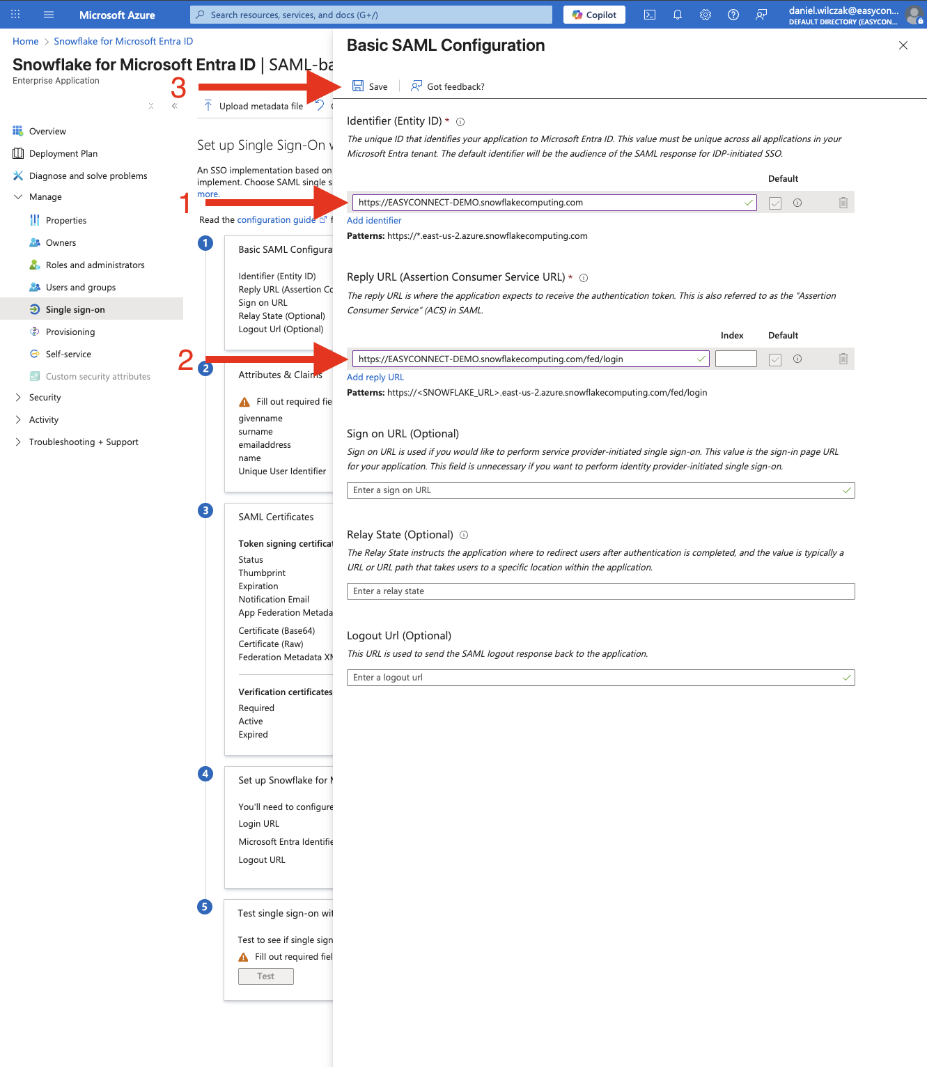 Once you have the form, enter in your account URL we got from Snowflake earlier. Make sure to add in the https:// for both and /fed/login for the reply URL. Click save once entered.