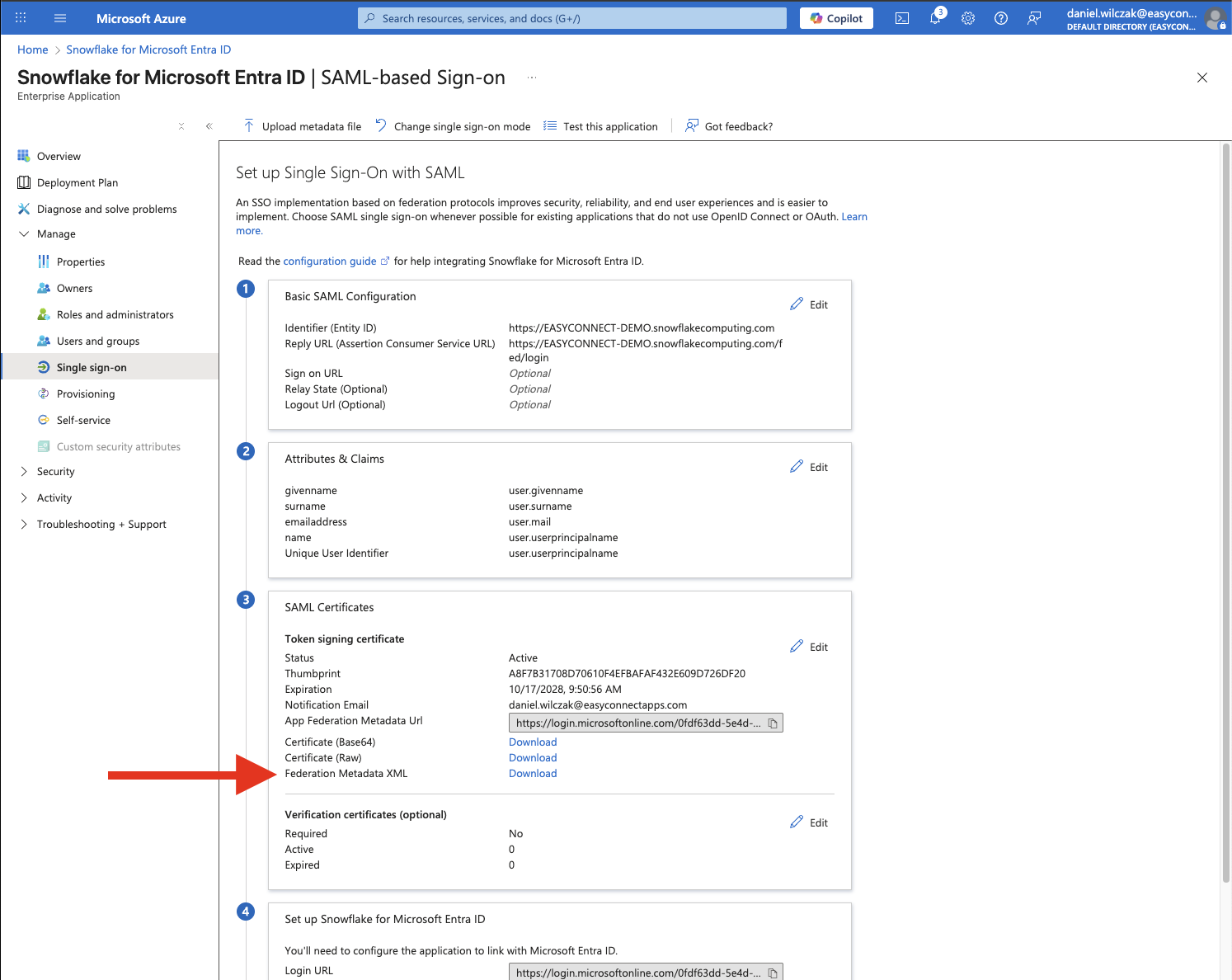 Go back to the application's SAML-based Sign-on page, scroll down to the SAML Certificates section. Download the Federation Metadata XML. We will use this file in our Snowflake steps later.