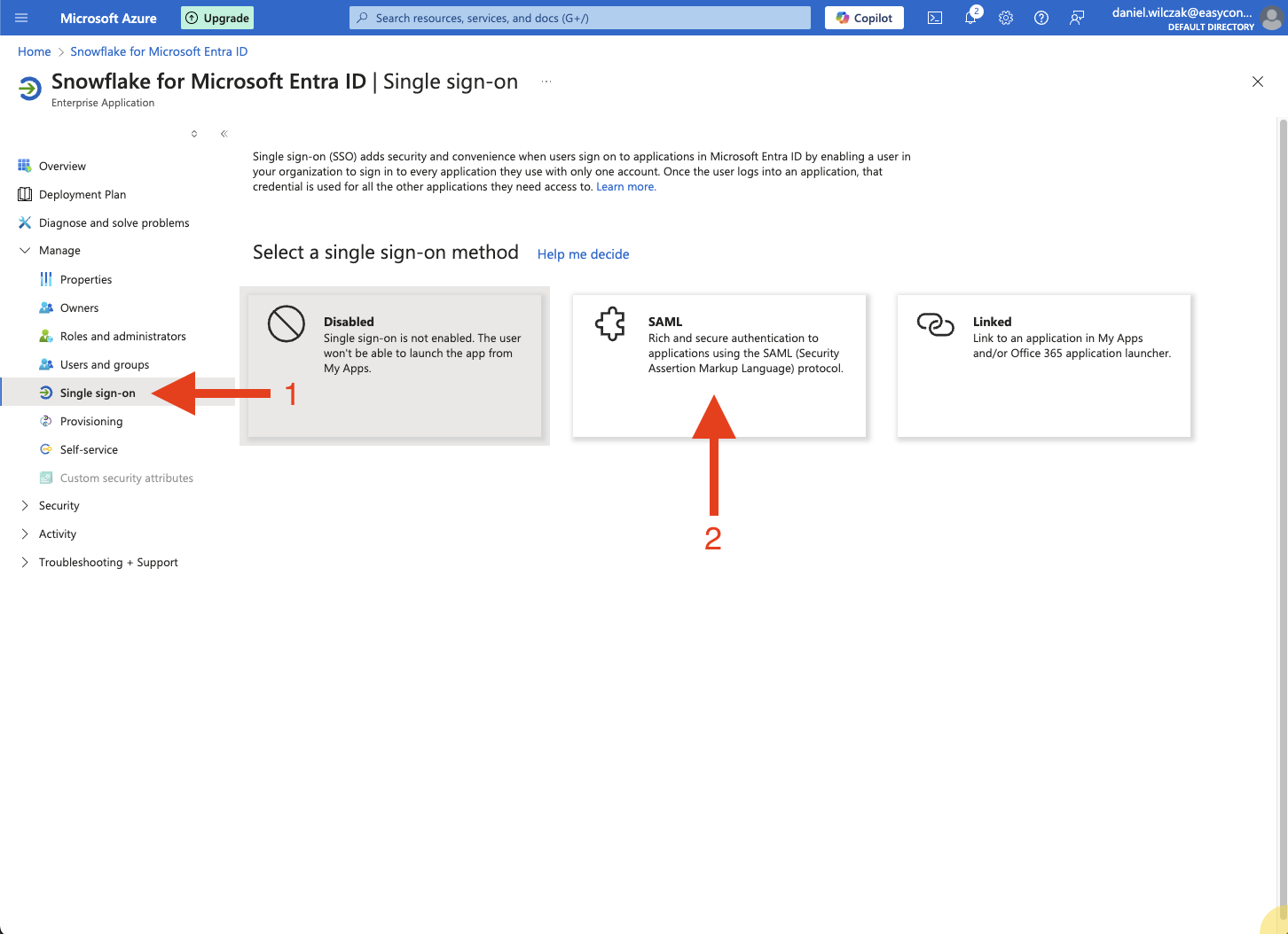 Once the application is created, on the left side choose Single sign-on, then choose SAML in the middle panel.