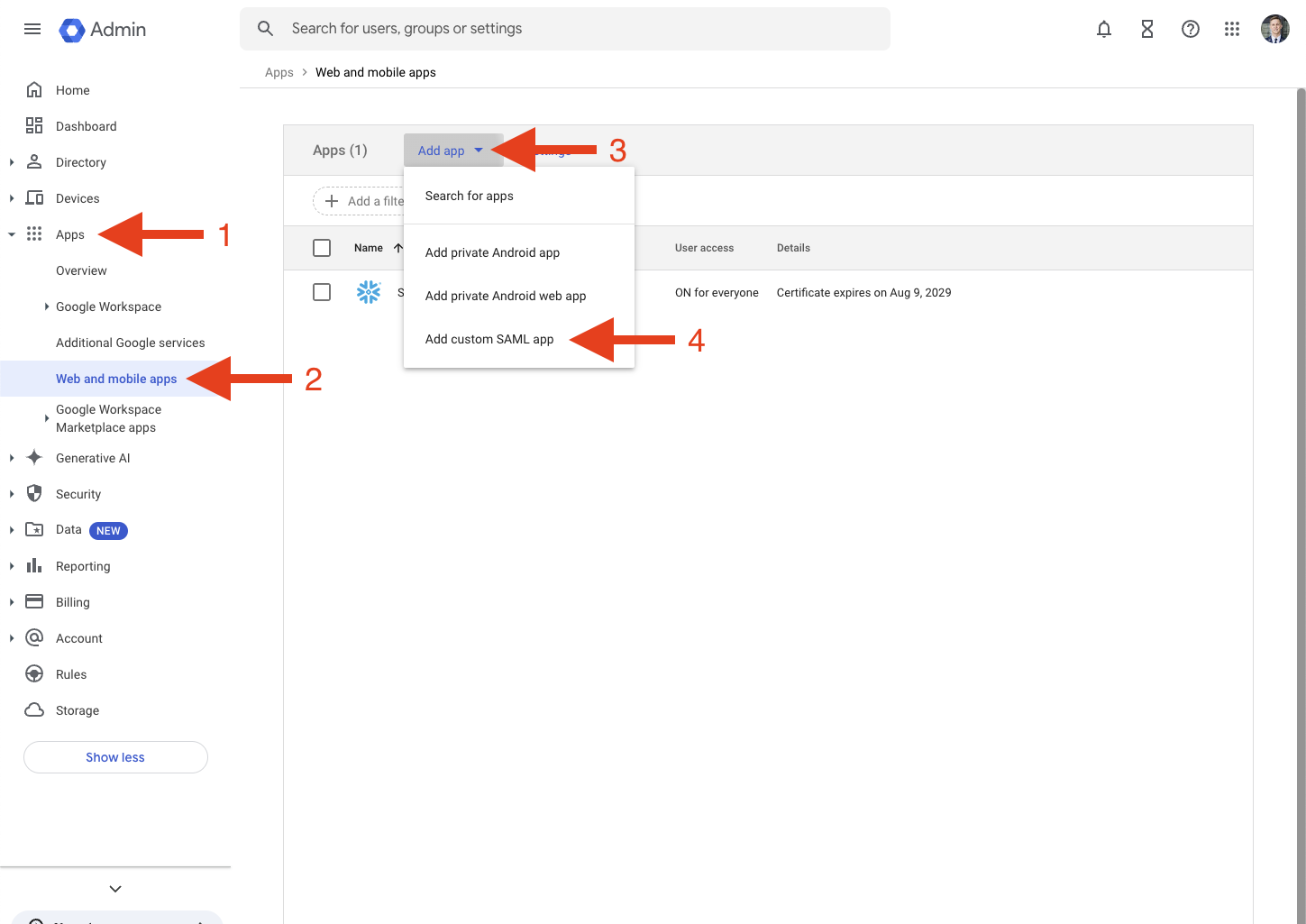Click Apps > Web and mobile apps > Add app > Add custom SAML app.