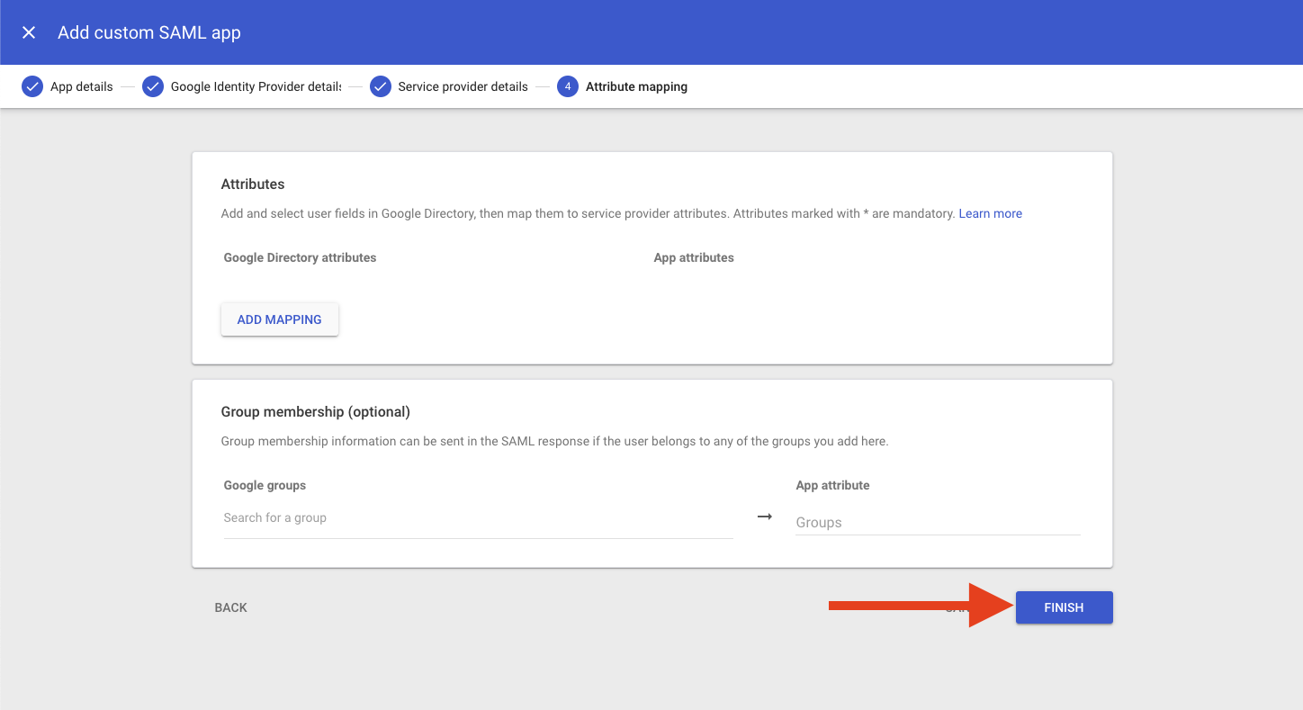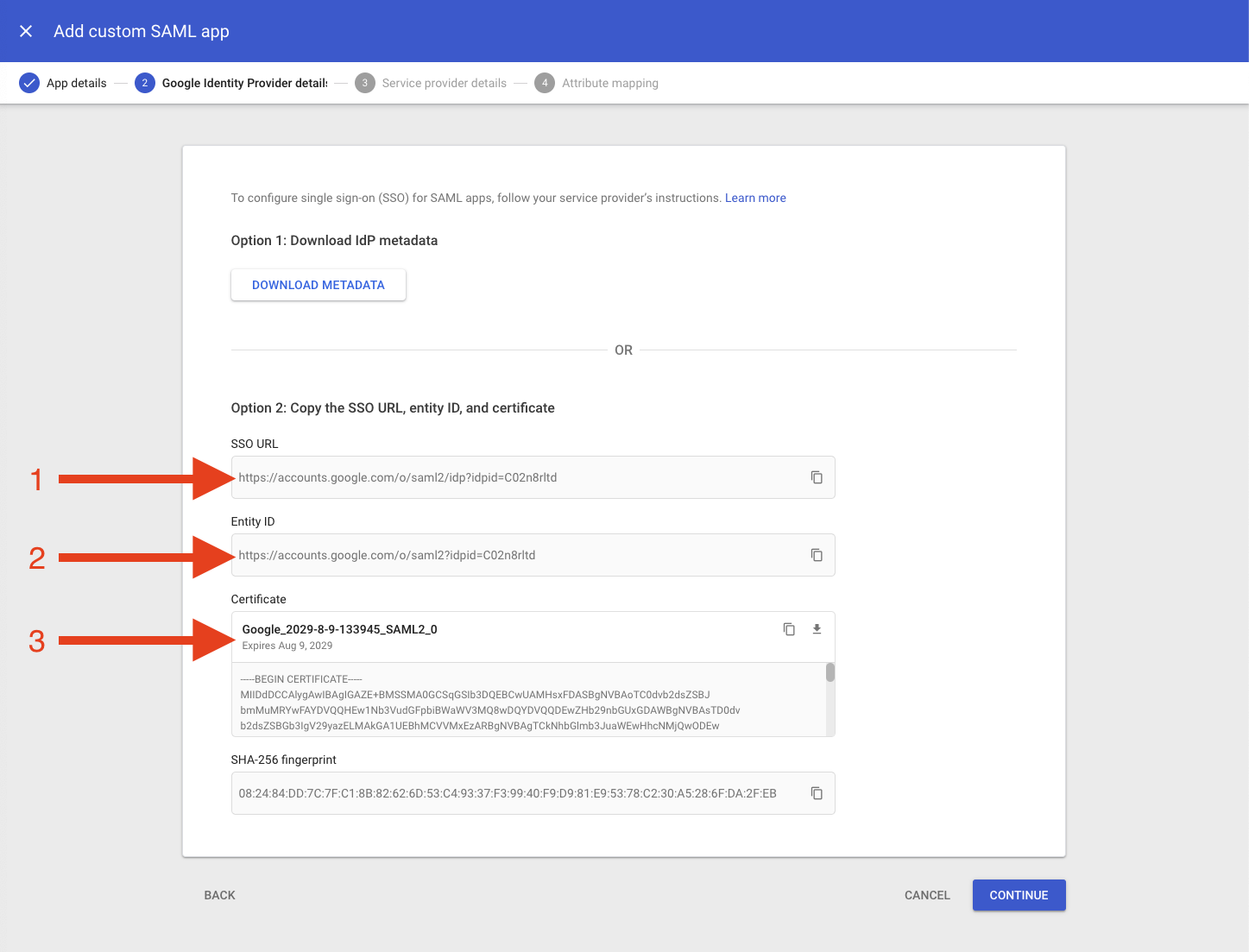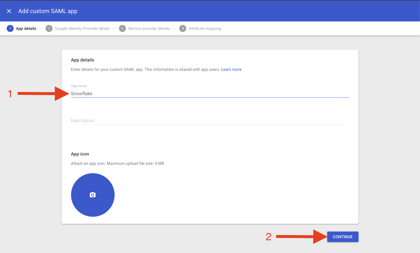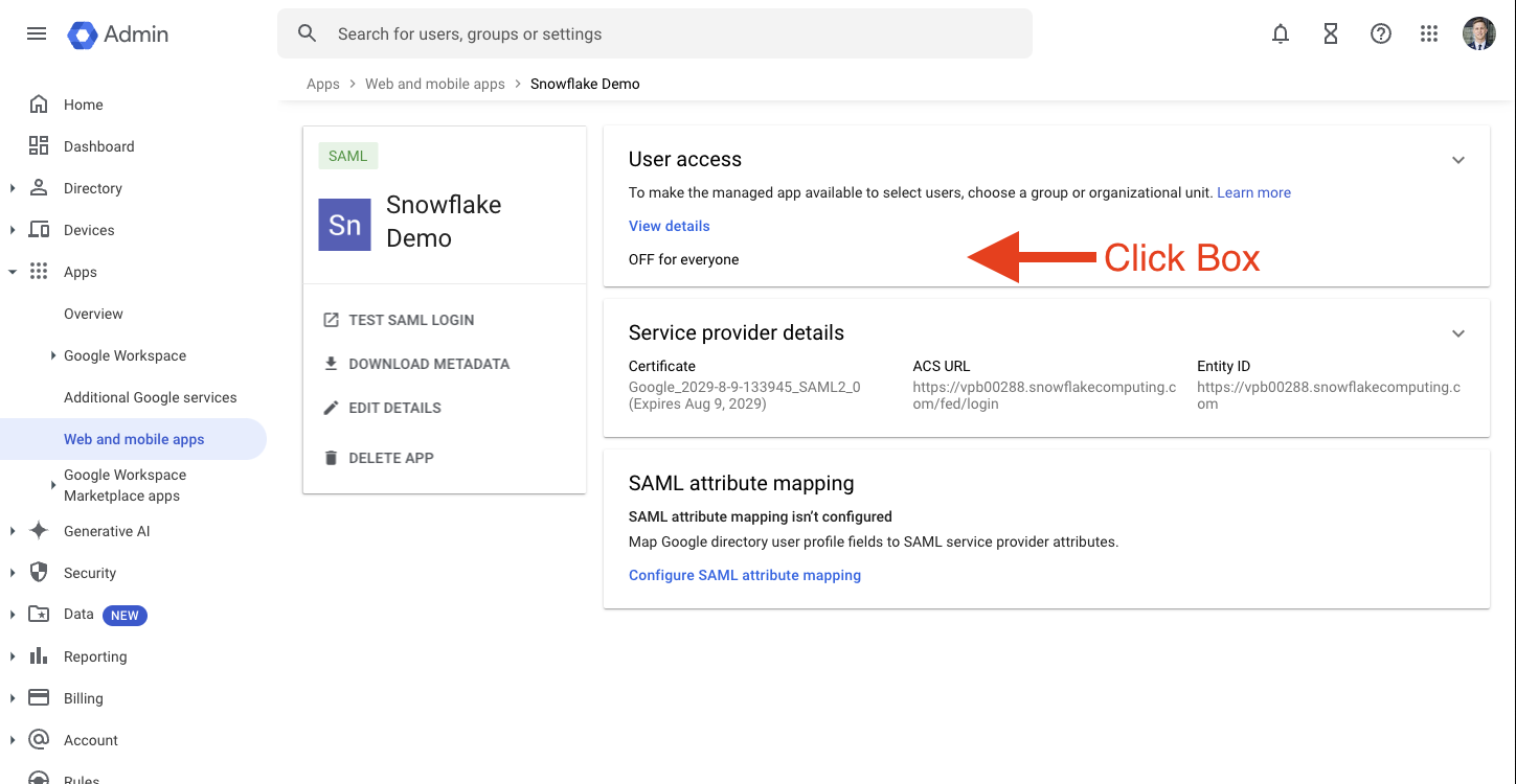 Lets take the output of our Snowflake and finish off in Google. Take the SAML2_SNOWFLAKE_ACS_URL -> ACS URL and SAML2_SNOWFLAKE_ISSUER_URL -> Entity ID