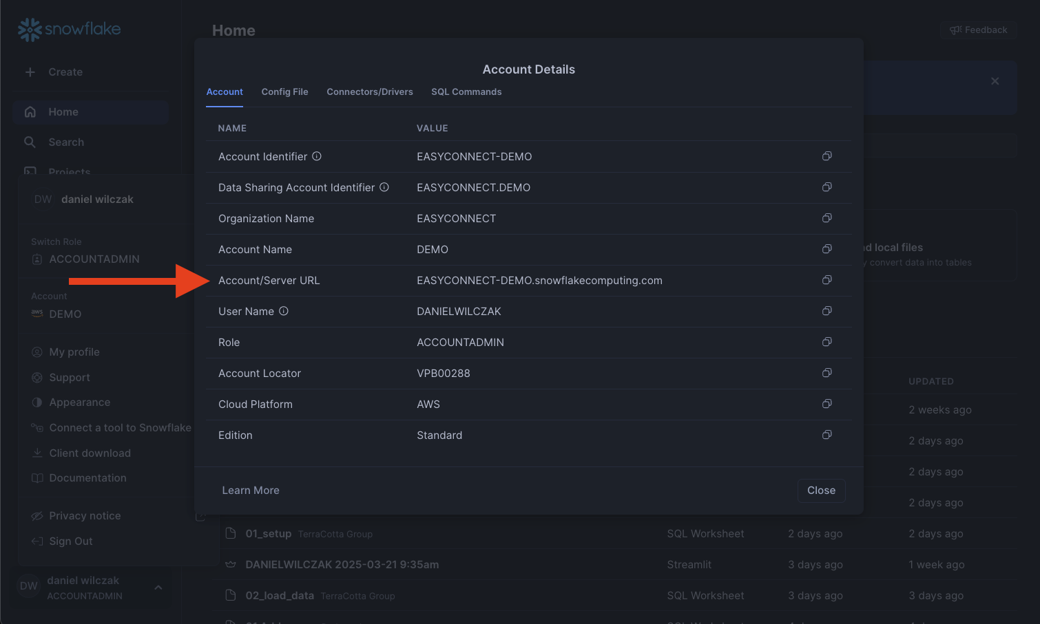 Before we leave Snowflake we'll want to copy our account url to later add to tableau.